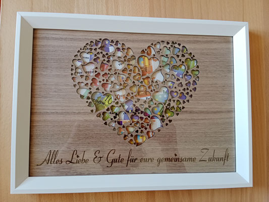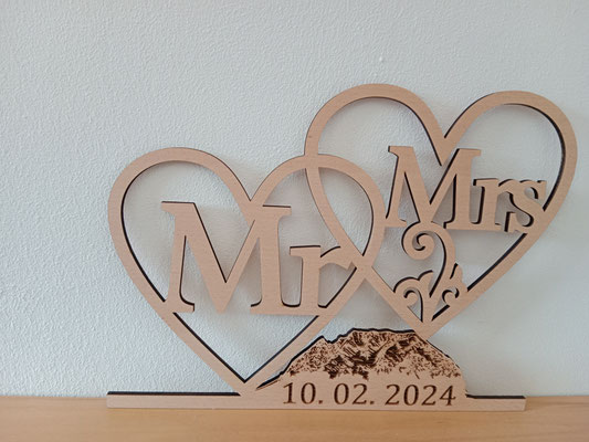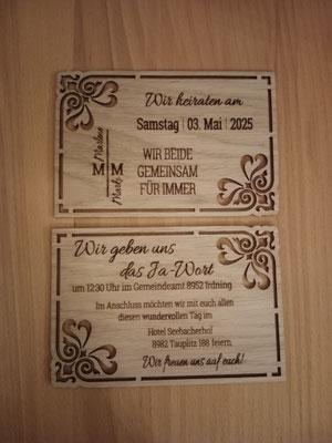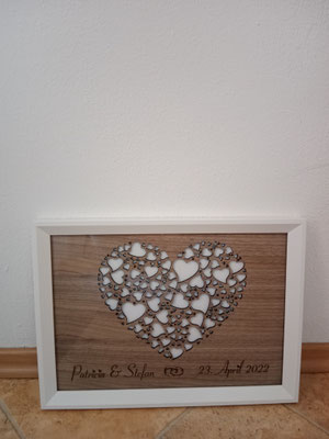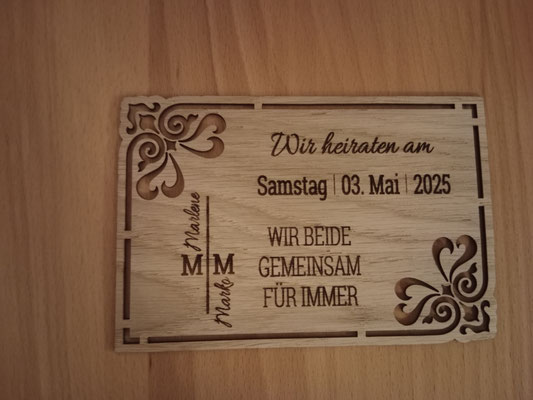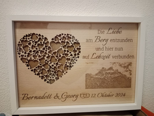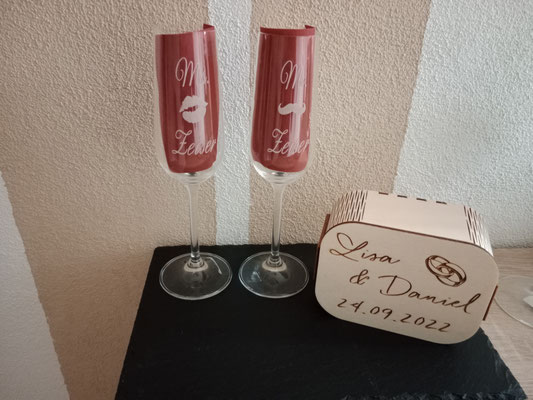 Ob gravierte Weingläser, Holztafeln mit Namen und Datum, edle Schilder, Bilderrahmen oder Geschenkboxen – jedes Stück wird zu einem Unikat, das die Geschichte des Paares festhält.